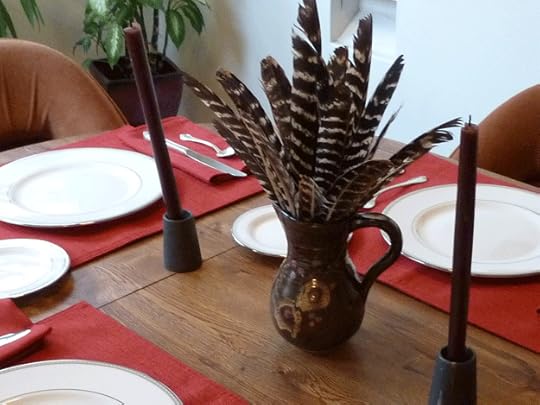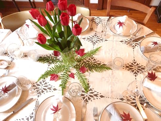 When you get a bunch of designers together for a holiday meal, this is what the table setting ends up looking like. Amazing! Claudia out did herself with candles, tiny Japanese maple leaves on each napkin, native ferns in the middle and lush, bright tulips. Well done lady.