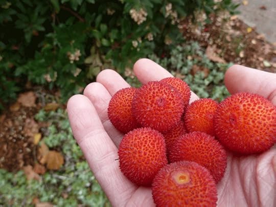 Strawberry Tree, Arbutus unedo, is native to the Mediterranean, but becoming more common as an ornamental in the US. Look a little closer and you will see odd-looking red, edible fruits hanging off the branches. I see this unusual edible all over town and have been enjoying it as a snack to and from class. The better tasting fruit has a hint of strawberry-like flavor.