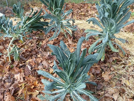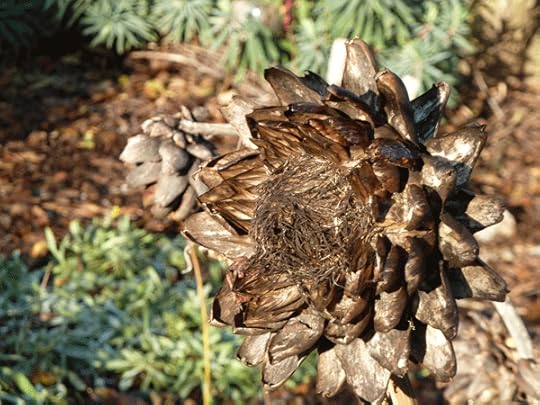 Artichokes, my favorite vegetable, make pretty winter flowers – little memories of their perennial contribution to the homestead.