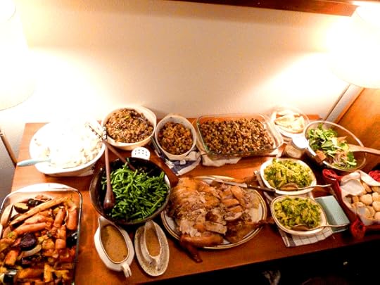 The spread! Final menu: Herb roasted turkey & shallot gravy, slow roasted root veggies, brussel sprouts w caramelized shallots, green beans w pine nuts & lemon, yam empanadas, garlic smashed potatoes, chanterelle stuffing, cornbread-sausage-apricot stuffing, fall salad, orange-cranberry sauce and angel buns.