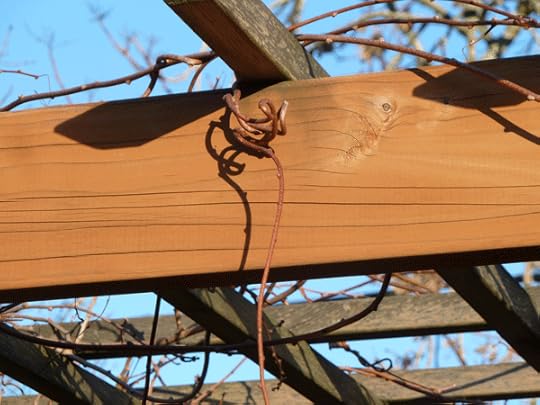 A little tendril from the hardy kiwi vine sneaks down the pergola. The female and male vines cover the whole top of the pergola now.