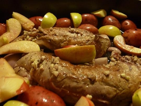 Arrange potatoes, apples and shallots around the pork in the roasting pan. Pour wine and broth over everything.