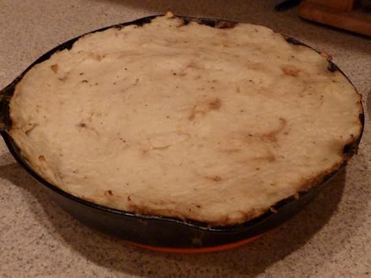 We used homegrown carrots, peas and kale plus store-bought potatoes and ground beef. In a alrge cast-iron skillet, the beef was cooked first until browned. We made a simple, creamy gravy and mixed in the cut up veggies with the beef. The "pie" was topped off with mashed potatoes, like a crust. Everything baked for about 45 minutes, until the carrots are done. We all devoured it! Awesome meal on a cold winter night.