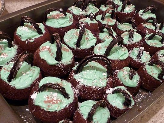 The Cauldron Cakes were time consuming little buggers! We baked up some devil's food cupcakes. After they were cool, we added a few drops of green food coloring to frosting and frosted them all. We then sprinkled on some powdered sugar and brown sugar to make it look a little foamy. We then cut black licorice into little strips to plug in the tops like handles. I kind of wanted them to look a lot more impressive for how much time it took, but oh well.