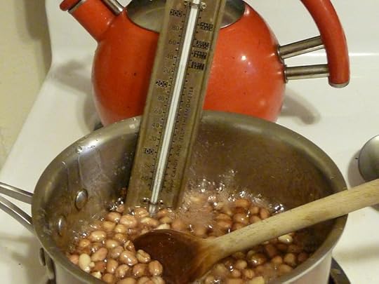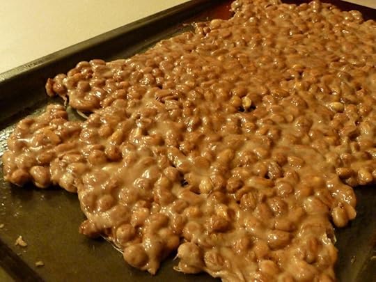 The first candy experiment was with peanut brittle. I found a great, easy recipe online here. I really hate, hate, hate using corn syrup, but I've been too afraid to experiment with a substitute. It would pain me to have to throw out a batch of something that took an hour of stirring to make, but maybe I need to belly up to the bar and get over that.
