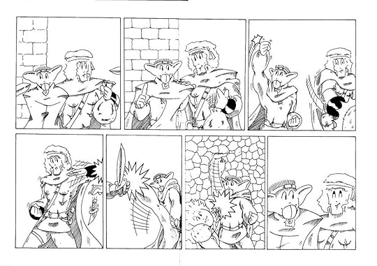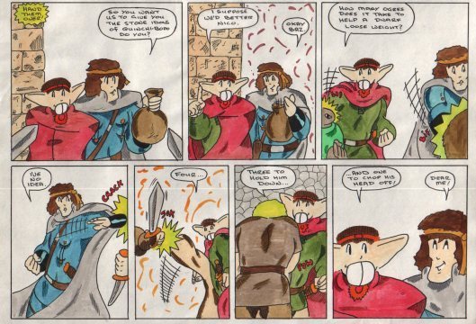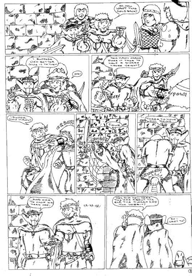 The Quest for Perfection used the framing device from Princess Bride – one of the most quotable movies ever. I liked it and loved the characters but I wasn’t happy with the end result. Roughly ten years later I re-visited the story and re-wrote and illustrated it from scratch. The framing device was dumped and it became a straightforward quest story with a bunch of adventurers and their encounters. Everything was done on A4 paper, even the letting and acrylic inks. My artwork had evolved and so had the characters. I was heavily influenced by Albert Uderzo’s work on Asterix and I adore his illustrations.