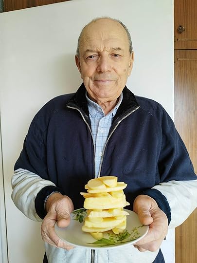 На снимката – моят татко, с ябълка, подредена така, че да няма начин да откажа да я изям.