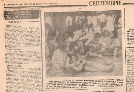Имаше една снимка във вестник „Септември" на тази батална сцена – млади хора пеят на улицата. После, когато стана… това с Орлин, отидох да поискам снимката в редакцията, бяха минали месец или два, но фотографът ми каза, че не може да я намери. Днес прерових течението на вестника за 1990 (машина на времето, твоето име е Библиотека!) и я намерих, разбира се, качеството е напълно ужасно – броят на вестника е от петък, 20 юли 1990…