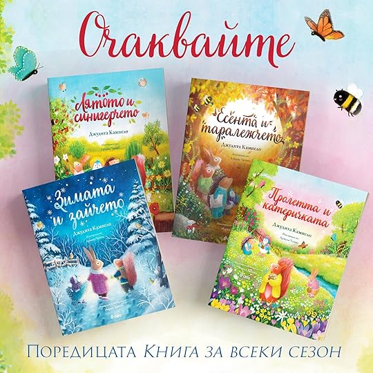Четирима приятели – зайче, катеричка, синигерче и таралеж, заедно посрещат и изпращат сезоните в прелестната гора. Много красиви книги, написани от Джудита Кампело и илюстрирани от Ариана Чичио, и препеани от мен, скоро ще бъдат в книжарниците, за да ни радват и да си четем и разглеждаме и да се чувстваме щастливи.