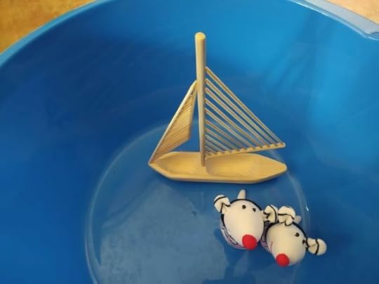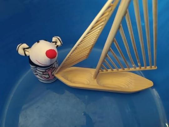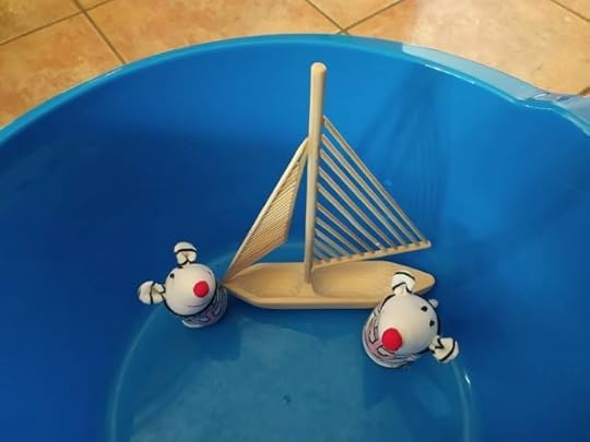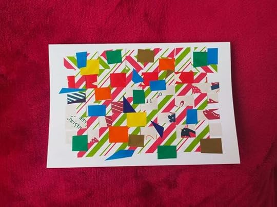 Само че ще ми трябват някакви други хартии… Дебелите не залепват добре, тънките се сгърчват, лепилото с брокат не съхне, сухото лепило станало на гума, я да видя какво има в онзи шкаф, останаха ли от цветните картони (останаха, ама картичката стана морска и лятна)…