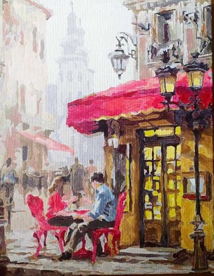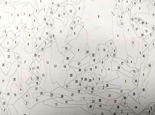 Пък и се оказа, че и в тези неща има степени на трудност. Схемата е отпечатана върху платното и започваш да нанасяш цветовете – 30 цвята и три четчици, най-дебелата – колкото кибритена клечка. Платното е 40/50 см, човек все едно бродира гоблен. Аз лично не съм бродирала такова нещо, защото дори мисълта непрекъснато да броя ми е неприятна. Освен това, докато нанасяш всяка боичка – точки и чертички, и започваш с бяло, по-бяло, по-малко бяло, светло бозаво, бозавеникаво… никакви линии не се открояват, никакви форми.