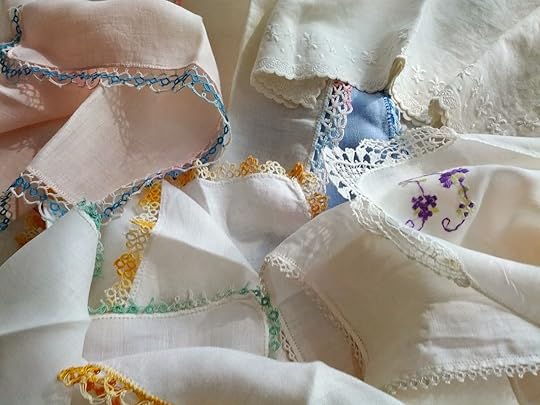 I finally got up the courage to go through my mother's dresser. Two years have passed since she died, and in that time I've gone through the entire house, emptying and sorting. In June, my sister and I emptied the dresser. It was hard, but not as hard as it would have been last summer, when we were emptying out the attic. My mother's dresser was neat as a pin and smelled like lavender. I photographed almost every item, unwilling to let her personal things go without retaining a memento. Jewelry, scarves, my father's wartime ID bracelet (before dog tags), a necklace of gold beads that had belonged to her mother, dress gloves, a box full of discarded hearing-aid batteries with hundreds of notations in her handwriting, signifying the dates they had been changed. Her bedroom, her private sanctuary for 67 years, now bears no trace of her. But I have the photographs, and the handkerchiefs (my sister has the gold beads). I remember her giving one to me every Sunday when I was a kid (I would pick). That was so I would have something to carry in my purse besides the dime for the church offering. The lace and the embroidery was done by Grandma Tucker.