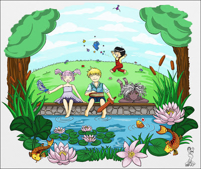 Happy birthday to Soledhan, Little Jaicobh, and Prince Dorrin! Since the boys share close birthdays, they celebrate them together in one large commemoration with the whole family. As a birthday gift, Kai Linaa made this picture for the boys and decided to join them herself by the pond and take part in all the revelry that such happy moments can furnish.
