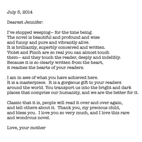#TBT to this email from July 5, 2014. Subject line: “a fan letter from your mother.” The summer before All the Bright Places came out, my mom read the manuscript and sent me this message. One month later, she died quite suddenly and unexpectedly. She never got to hold the printed book in her hands or see it on shelves or witness the extraordinary love of my remarkeyable reader family, but she read it. And I will treasure these words from her forever. ❤️ #allthebrightplaces #throwbackthursday #theodorefinch #violetmarkey #letters #imissmymom #wordsoflove #wordsmatter #atbp #mybest