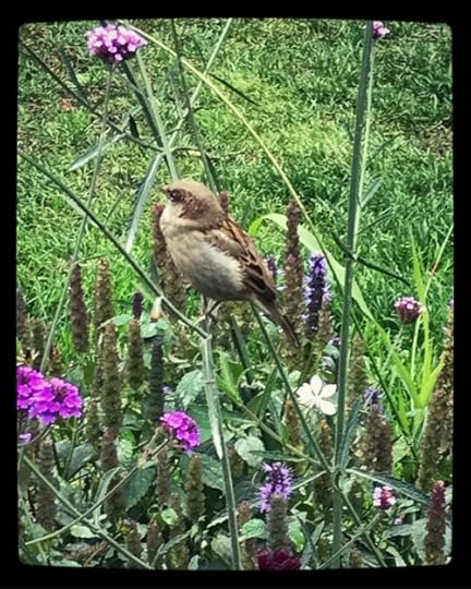 When you’re in the garden across from your hotel and you spot this little finch sitting among the purple flowers.
