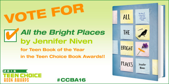 All the Bright Places is nominated for Teen Book of the Year! If you loved the book, Finch, Violet, or all of the above, please cast your vote. It would mean the world to me.
