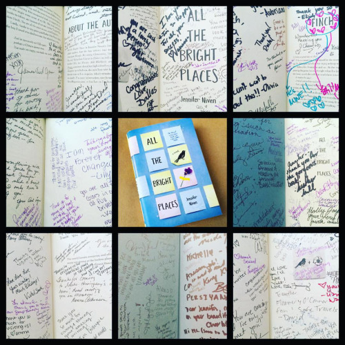 All the Bright Places is one year old today! In honor of the book’s anniversary, I’ve been rereading all the lovely things readers have written in the pages of my special copy, the one I’ve been carrying with me to every event since last January 6.