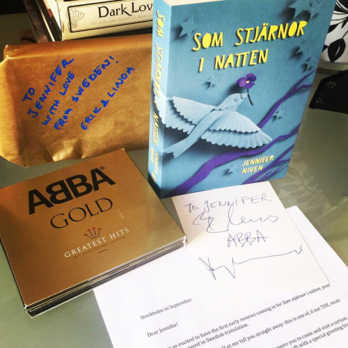 Today’s bright place: a package from my Swedish publishers who know my undying love for ABBA. Not only is the Swedish book SO INCREDIBLY, GORGEOUSLY LOVELY, but they enclosed the loveliest note AND an ABBA box set AND autographs from Bjorn and Benny, the two B’s!!
