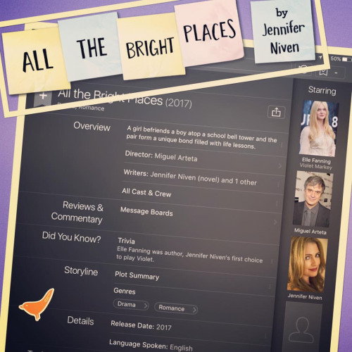 The All the Bright Places IMDB page is lovely! And it’s growing! I can’t wait till we #findfinch and the rest of our cast. (Look at me on there as screenwriter!)