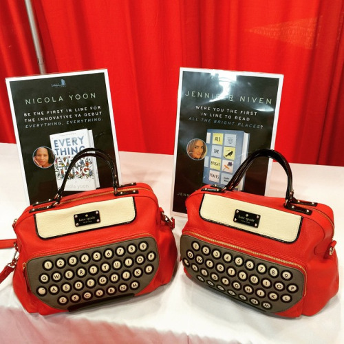 Most of you know about The Famous Typewriter Bag, but my friend and fellow YA author Nicola Yoon has one also. Look! The bags are friends too! ❤️️ #allthebrightplaces #katespade #nicolayoon #everythingeverything #jenniferniven #BookCon2015 #FirstinLine #bookbag #TheBag #typewriterpurse (at Javits Center)
