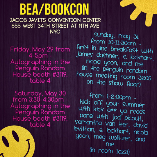 I’m headed your way this weekend for #BEA15 and #BookCon2015, where I’ll be signing books and appearing alongside James Dashner, E. Lockhart, Jodi Picoult, David Levithan, Meg Wolitzer, Nicola Yoon, and Samantha van Leer. I’m already fangirling. Hard.