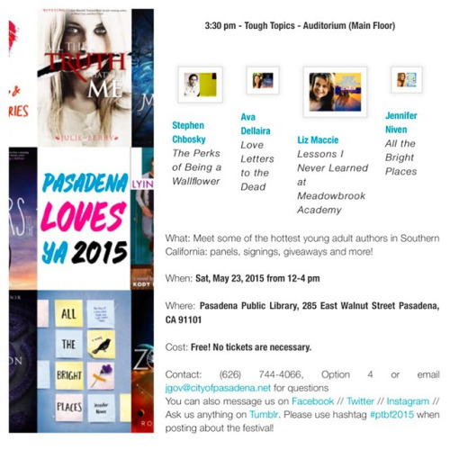 I’ll be in Pasadena, CA, this Saturday because Pasadena Loves YA! And OMG I’m doing a panel with Stephen Chbosky. I can’t even. (*fangirls wildly*)