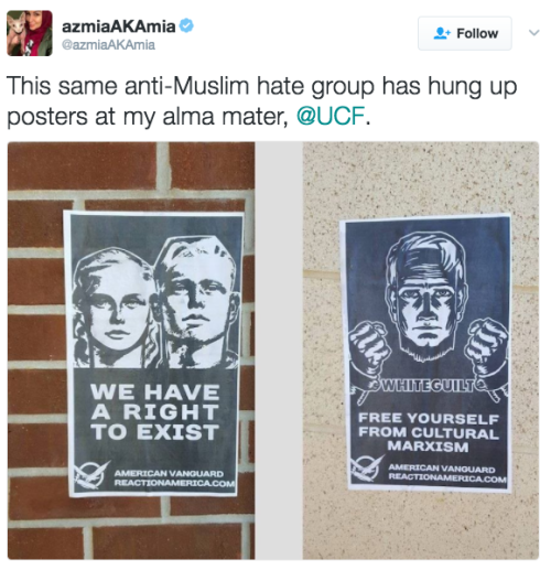 White nationalists are posting “Imagine a Muslim-Free America” fliers on college campuses Anti-Muslim fliers affiliated with the American Vanguard, a white nationalist organization, have appeared on college campuses nationwide.