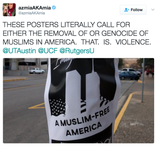 Students from the University of Texas at Austin, University of Central Florida and Rutgers University tweeted photos of a flier reading “Imagine A Muslim-Free America.“