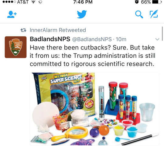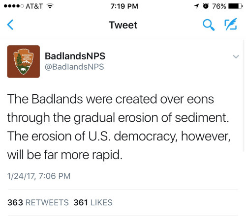 The Badlands National Park Twitter has been tweeting in open defiance of the administration’s gag order today, though most of them have been deleted.