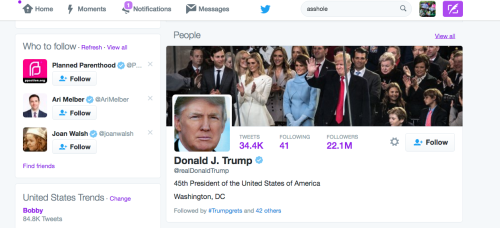 Type in asshole in the twitter search and look he shows up? The king of assholes.