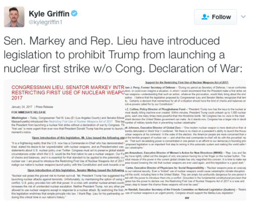 Democrats introduce a bill to prevent Donald Trump from launching a nuclear war Senator Ed Markey and Rep. Ted Lieu introduced legislation intended to prevent Trump from using nuclear weapons in a first-strike scenario without the explicit approval of Congress on Tuesday.