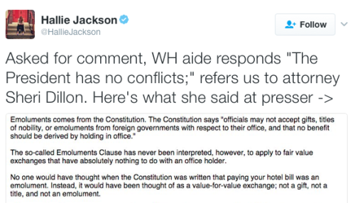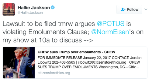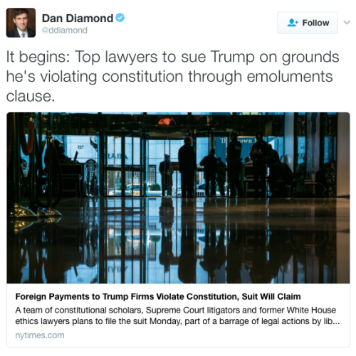 Ethics lawyers are suing Donald Trump for violating the Constitution On Monday, Trump will be hit with a lawsuit that alleges he’s in violation of the Constitution’s Emoluments Clause, which prohibits politicians from receiving payments from foreign governments.