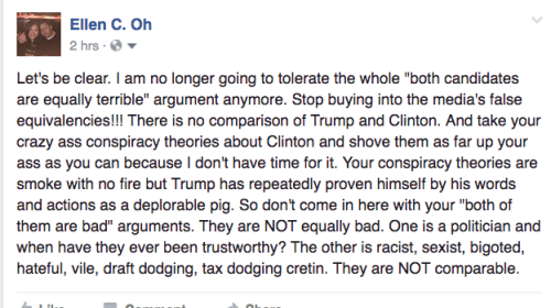 No more excuses people. We are in one of the most dangerous historical moments of our lifetime. We cannot let this vile racist, sexist, bigoted pig represent us and all that we stand for. We cannot allow him to appoint ANY Supreme Court Justices to our highest court. We cannot let him get away with his campaign of hate. I’m looking to you young folk to take back your futures! I’m looking at my fellow sisters in arms to fight against misogyny! Register to Vote! Let your voice be heard! Let the...
