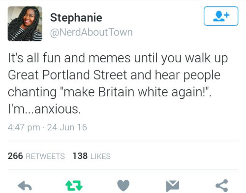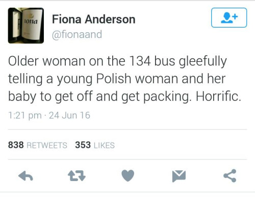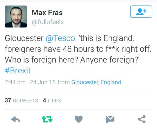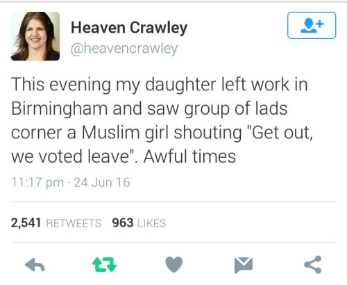 “Worrying Signs” shows the atmosphere of hate in the U.K. post BrexitHate speech against minorities appears to be on the rise in the wake of the Brexit.With that in mind, Sarah Childs, Natasha Blank and Yasmin Weaver created a Facebook photo album of screenshots revealing incidents of hate titled “Worrying Signs.“One woman recounted the horrifying story of being approached at a London bar by a middle-aged white man.