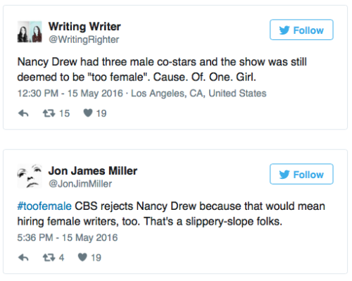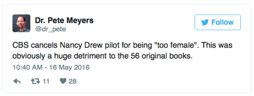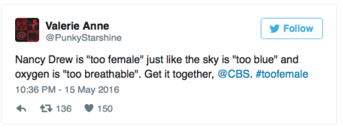 CBS reportedly passed on Nancy Drew because it was“too female”So much for a modern, non-white take on Nancy Drew. The update was set to starIranian-Spanish actress Sarah Shahi, but CBSpassed because, despite testing well, it"skewed too female.” The network was deciding between Drew and Doubt — and went with the latter, which at least gives this a silver lining.