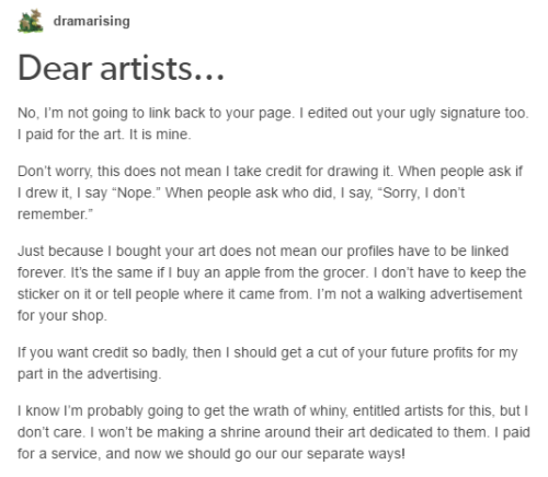 Once an artist creates a work, they own the copyrightNone of this“I paid for the art. It is mine.” bullshit, unless the artist actually sells you the copyright (something which has to be stated and never assumed, and something you would have to pay extra for) you can not claim ownership over the piece,...