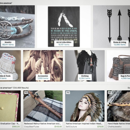If you search “Native American” on Etsy, you will get 134,468 product results. Unless these items are made by Native people, it is illegal to label or tag products as “Native American.” This is a violation of the Indian Arts and Crafts Act and it needs to be reported. Everyday, non-Native Etsy shop owners upload and falsely label their products as Native American to get more sales. These unethical businesses seek to line their own pockets while taking valuable business away...