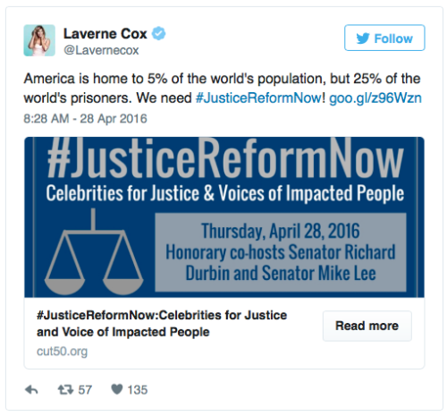 Laverne Cox, Matt McGorry, Gabourey Sidibe, Russell Simmons, Margaret Cho and other celebrities are advocating for criminal justice reform in the United States by promoting Cut50’s #JusticeReformNow campaign. Cut50, a bipartisan coalition seeking to safely reduce the number of jailed people in the U.S. by an ambitious but important number.