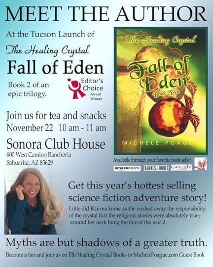 On Saturday, August 6, 2011, we'll be celebrating the launch of Michele's 2nd book in the The Healing Crystal Trilogy series, Fall of Eden, from 1:30 until 4:30, followed by Monte's Famous KC Smokin' Rib Feast at 6pm and music from Studio G at 8pm. All are welcome!