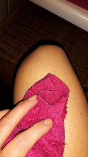 (I know, I know - it's Monday... see below)I was getting ready to take a photo of the simple pleasure of being barefoot but I had a an accident and ended up spilling boiling water all over my thigh.So - A very different pic to that intended...the simple pleasure of a cold wet towel...