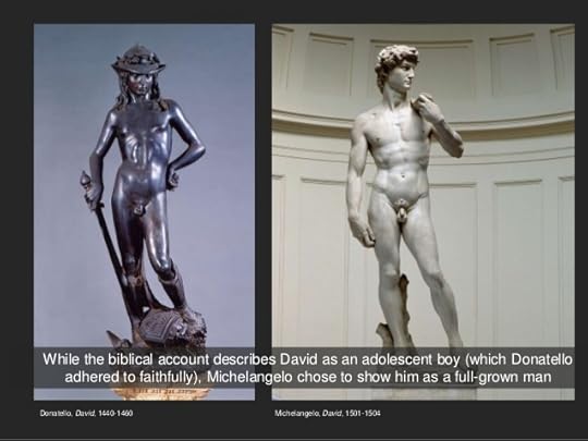 2. ஃபிலிப்போ லிப்பியின் 15ஆம் நூற்றாண்டு மறுமலர்ச்சிக்கால ஓவியம்).அதே காலகட்டத்தைச் சேர்ந்த மைகெலான்ஜெலோவின் பளிங்குகல் டேவிட் மற்றொரு “தூய மனிதனின்” வடிவம். ஆற்றலையும் உறுதியையும் அறத்தையும் வெளிப்படுத்தும் உருவம். அது கிரேக்கத் தொன்மமும் கிறிஸ்தவத் தொன்மமும் ஒரு மனித உருவில் இணையும் புள்ளி. அதே டேவிட்டின் உருவை நூறு வருடங்கள் முன்னால் டானடெல்லோ வெண்கலத்தில் வடித்திருக்கிறார். அந்த இரு சிற்பங்களைப் பார்த்தாலே அந்த நூறு வருடங்களில் “மனிதன்” என்ற கருதுகோள் அடைந்த தூரம் நமக்குத் துலக்கமாகும்.