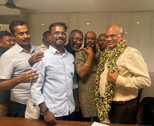 ஜனகனமன முடிந்ததும் அறைக்குள் வந்து எட்டிப்பார்த்தேன் லெமா புள்ளை குட்டிகள் சகிதம் சூழ பேரன்னையாக அமர்ந்திருந்தார். அவரையும் உஷா அவர்களையும் சுற்றி விஷ்ணுபுரம் நண்பர்கள். அடுத்து ஜெயமோகன் இருக்கும் அறைக்குள் எட்டிப்பார்த்தேன். ஒரே கோலாகலம். நண்பர்கள் வெள்ளத்தில் மைய்ய சுழியில் ஜெ. கட்டி அணைத்தல், முத்தமிடல், மாலைகள்,சால்வைகள்,ஆசிகள்,புகைப்படங்கள்…