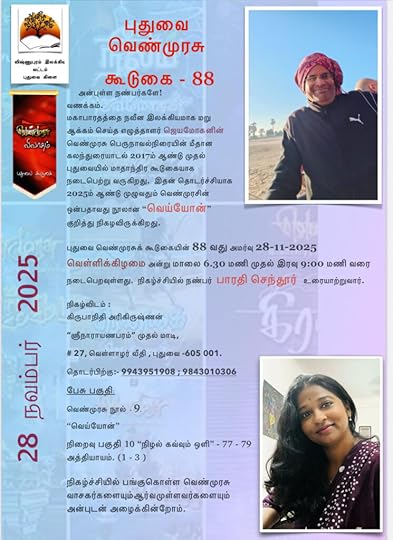புதுவை வெண்முரசுக் கூடுகையின் 88 வது அமர்வு 28-11-2025 வெள்ளிக்கிழமை அன்று மாலை 6.30 மணி முதல் இரவு 9:00 மணி வரை நடைபெறவுள்ளது.