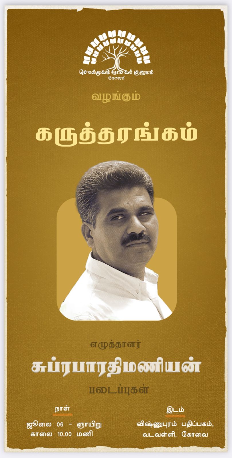 நமது சொல்முகம் வாசகர் குழுமம் ஒருங்கிணைக்கும் 7வது இலக்கிய கருத்தரங்கம் ஜுலை 6ஆம் தேதி ஞாயிறன்று கோவையில் நிகழவுள்ளது. அதில் எழுத்தாளர் திரு. சுப்ரபாரதிமணியன் அவர்கள் முன்னிலையில் அவரது படைப்புகள் மீதான வாசிப்பனுபவங்கள் முன்வைக்கப்படும். இலக்கிய ஆர்வமுள்ள நண்பர்கள் அனைவரையும் இந்நிகழ்விற்கு வரவேற்கிறோம். ஆசிரியருடன் உரையாடி மகிழ வேண்டுகிறோம்.