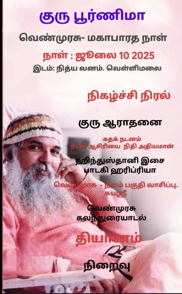 I expect my friends and readers to celebrate the day as Gurupurnima—Venmurasu Day. They can visit Vellimalai for the event. Or they can celebrate it at their homes; they can read Venmurasu on that day. It is enough.
