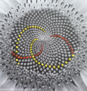 சூரியகாந்தியின் மையத்தில் விதைகளால் ஆன எதிரெதிர் திசைகளில் வளைந்த இந்த இரண்டு தொடர்ச் சுழல்களும் ஒன்றை ஒன்று தழுவிக்கொண்டும் இடையிட்டும் மிக அழகாக ஒவ்வொரு விதைக்குமான இடத்தை உறுதி செய்து அமைந்திருக்கின்றன.