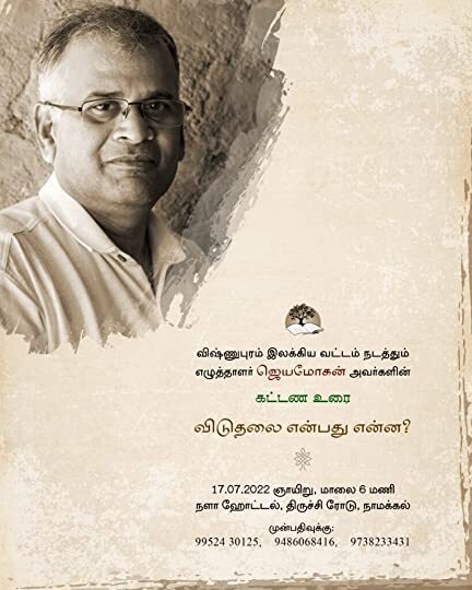 கடந்த 17.07.2022 (ஞாயிறு) அன்று நாமக்கலில் நடைபெற்ற கட்டண உரை “விடுதலை என்பது என்ன” என்ற தலைப்பின் கீழ் தாங்கள் ஆற்றிய உரையின் கூட்ட நிகழ்வில் கலந்து கொள்ளும் வாய்ப்பை எழுத்தாளர் சுரேஷ் பிரதீப் அவர்களின் வாயிலாக பெற்றேன்.
