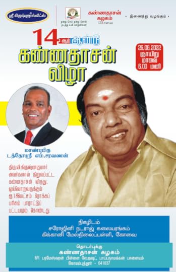 கோவை கண்ணதாசன் கழகம் வழங்கும் கண்ணதாசன் கலை இலக்கிய விருதுகள் 26 ஜூன் 2022 ஞாயிறு மாலை கோவை கிக்கானி மேல்நிலைப் பள்ளியில் உள்ள சரோஜினி நடராஜ் கலையரங்கத்தில் நிகழ்கிறது.