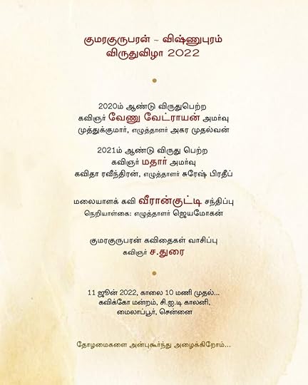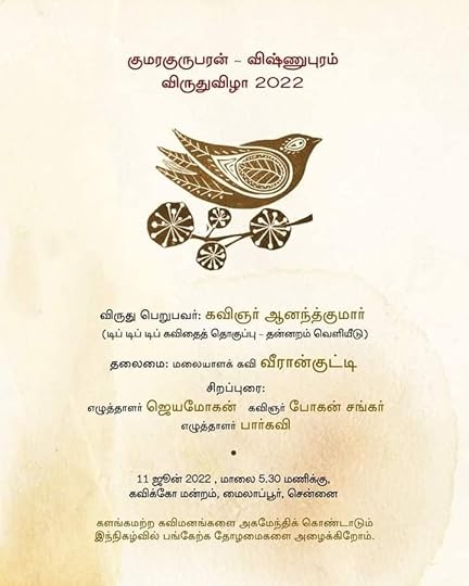 2022 ஆம் ஆண்டுக்கான குமரகுருபரன் விஷ்ணுபுரம் விருது கவிஞர் ஆனந்த் குமாருக்கு வழங்கப்படுகிறது. விழா வரும் 11 ஜூன் 2022-ல் சென்னையில் நிகழ்கிறது. ஜூன் 10 குமரகுருபரனின் பிறந்த நாள்.