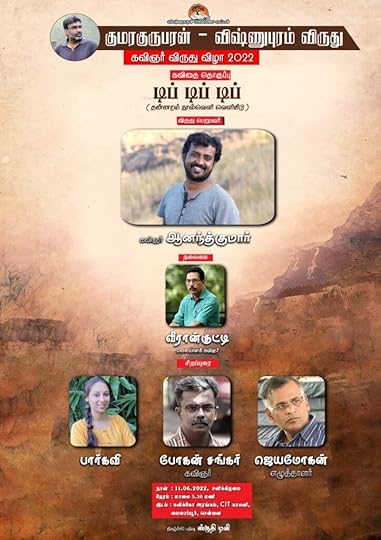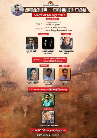 இவ்வாண்டு விருதுவிழாவை ஒட்டி மூன்று அமர்வுகளையும் ஒருங்குசெய்துள்ளோம். கோவிட் தொற்று காரணமாக சென்ற ஆண்டுகளில் குமரகுருபரன் விருது பெற்ற வேணு வேட்ராயன், முகமது மதார் இருவருக்கும் விழா என ஏதும் நிகழவில்லை. ஆகவே அவர்கள் இருவருக்கும் இரண்டு அமர்வுகள் நடைபெறும். சிறப்பு விருந்தினராக வரும் மலையாளக் கவிஞர் வீரான் குட்டிக்கு ஓர் அமர்வு.